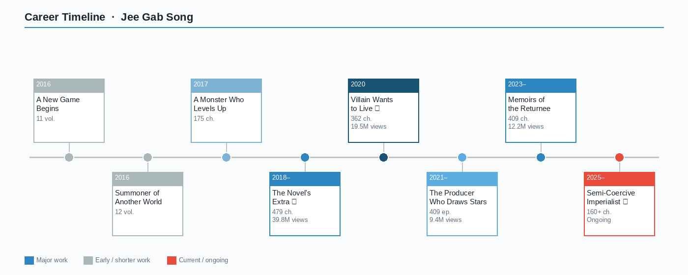 His previous pen name was 종갓집 (Jongatjip). A Kyobo Bookstore bio from that era described him as ‘a university student living alone somewhere on Earth who writes.’ When he switched to the Jee Gab Song name via Munpia’s one-time pen name change policy, he initially denied the connection. He was eventually exposed through old Kakao Page comment histories — a minor scandal Korean readers refer to as ‘필명세탁’ (pen name laundering). He has not commented on it publicly, because he doesn’t comment on anything publicly.