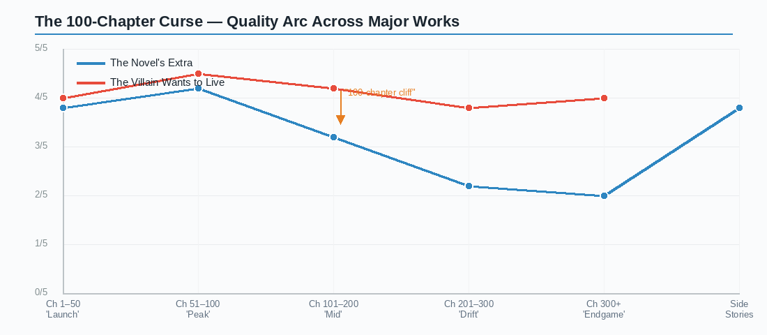The same arc holds for his other major works. Something happens around chapter 100. Fan pressure is part of it — he reportedly rerouted pre-planned story beats in The Novel’s Extra when certain character fandoms got loud enough, and the seams show. It’s the central frustration of following his work: he builds the architecture beautifully, then hands the keys to the crowd. If you want to see where his works fall in the broader landscape, DragneelClub’s complete web novel tier list has some honest takes on both The Novel’s Extra and The Villain Wants to Live.
