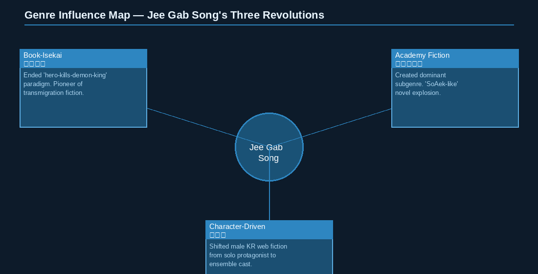His contribution to Korean web fiction isn’t one great novel. It’s a set of structural templates that became so widely adopted that most readers consuming academy fiction or book-isekai today are working within frameworks he established, often without knowing his name.